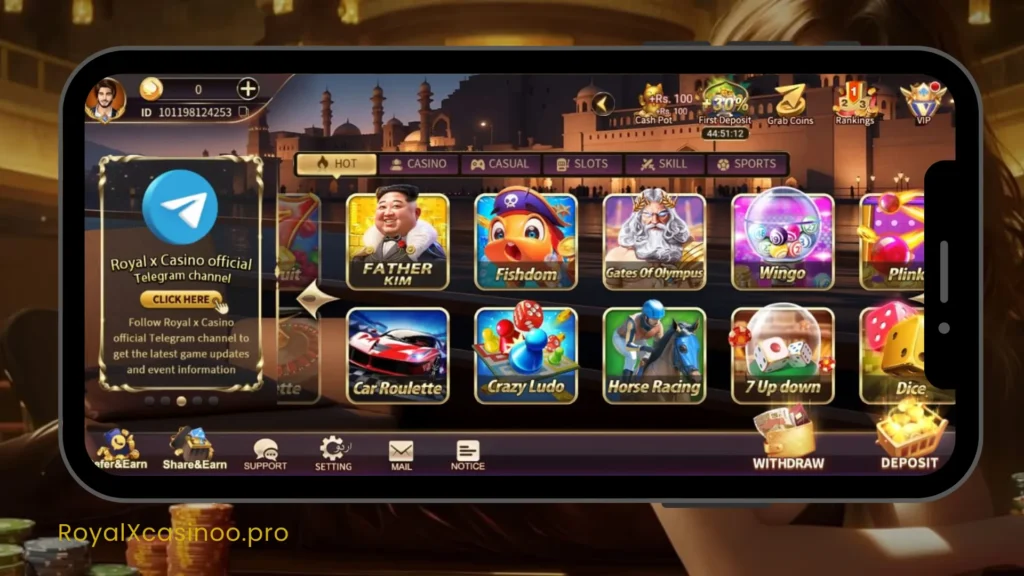 Welcome to the most popular online earning game, Royal X Casino. The app has been trending in Pakistan for almost 3 years. There is a wide range of different games available in the app. Games include Fishing, Quick Ludo, Toss A Coin, Dragon Tiger, Crush II, and many more. Players who want to experience real casino games virtually need to download them and start playing their favorite games.