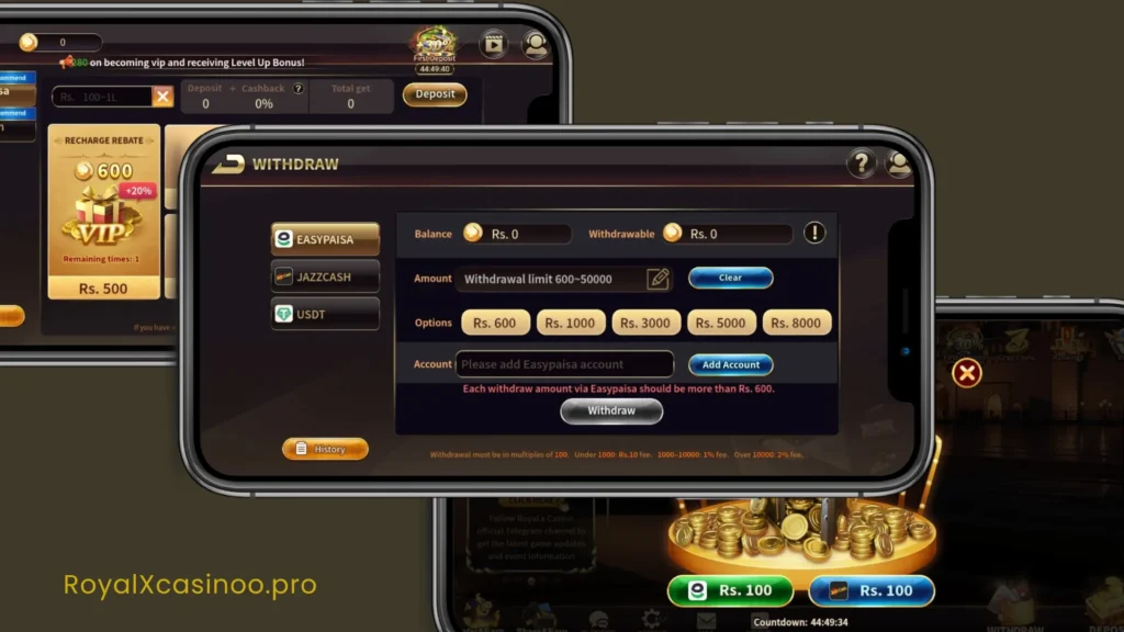 Welcome to the most popular online earning game, Royal X Casino. The app has been trending in Pakistan for almost 3 years. There is a wide range of different games available in the app. Games include Fishing, Quick Ludo, Toss A Coin, Dragon Tiger, Crush II, and many more. Players who want to experience real casino games virtually need to download them and start playing their favorite games.